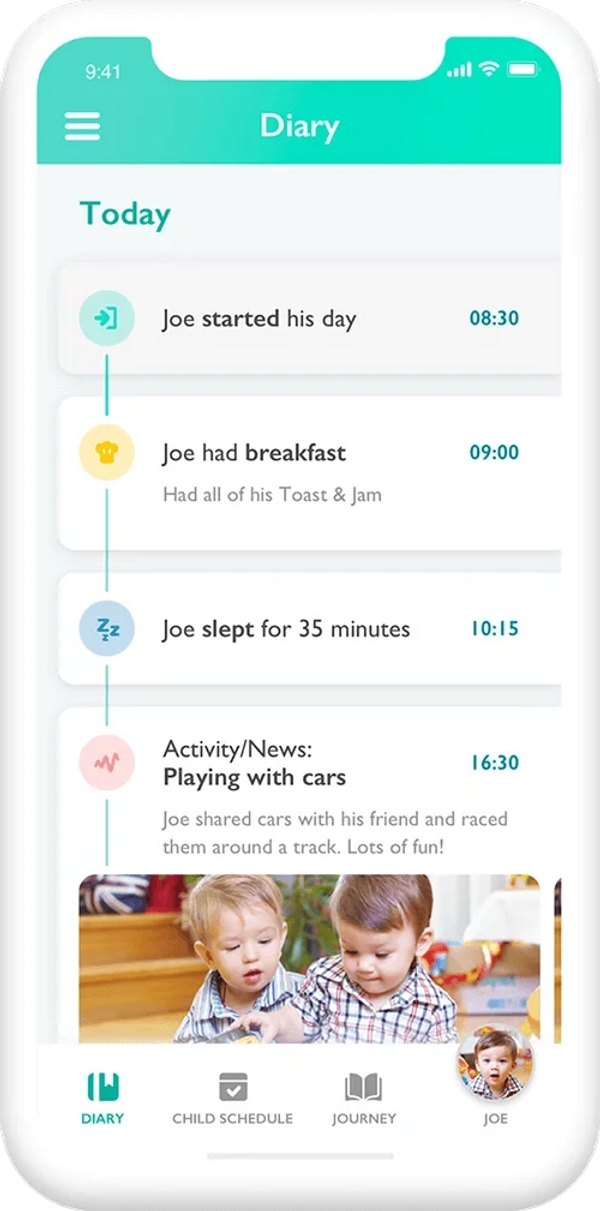 On request, a daily diary can be inputted and sent directly to your phone at the end of each session. It is displayed as a timeline, showing all meals, nappies and activities carried out during the day.